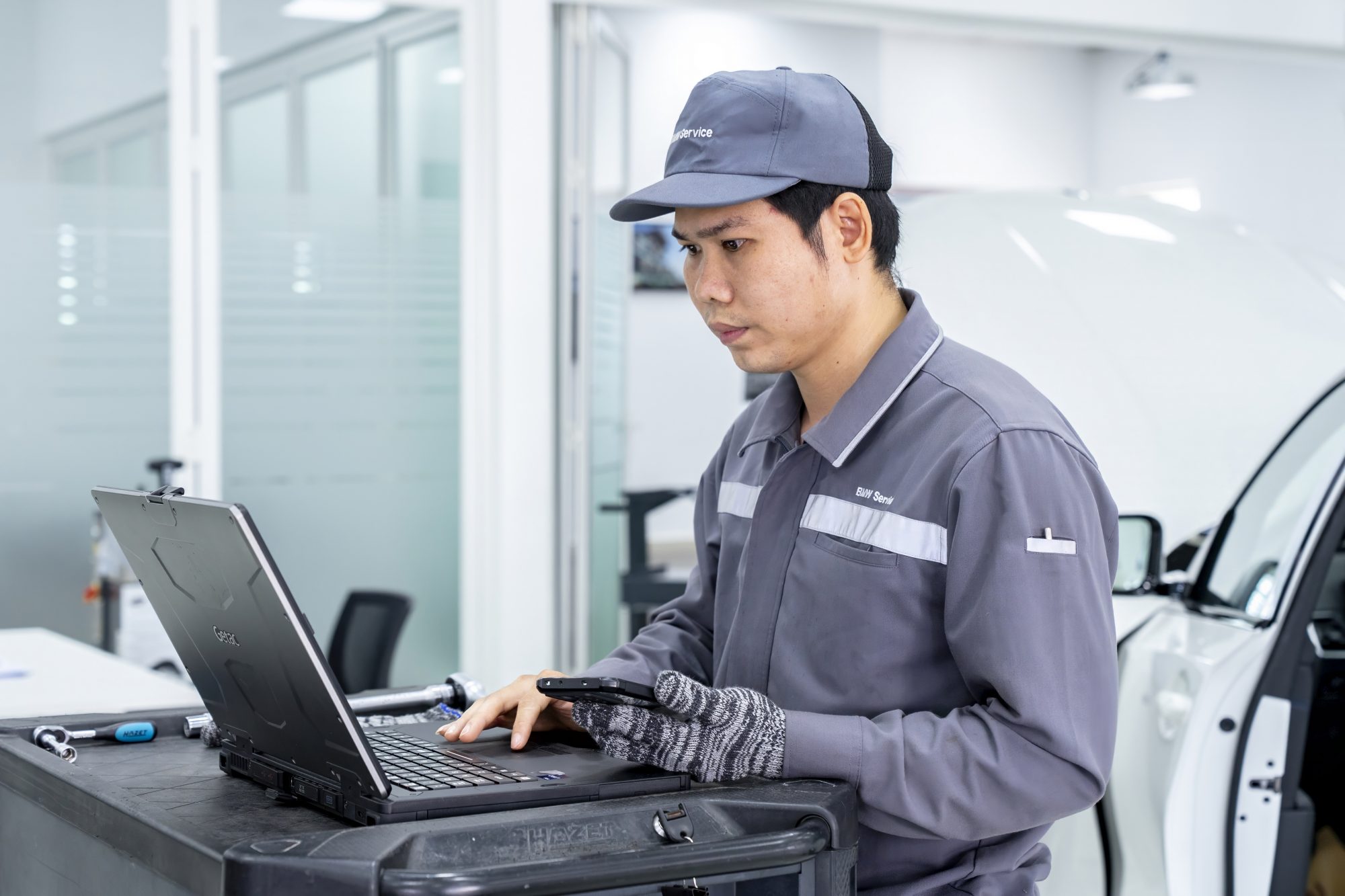 Kỹ thuật viên sử dụng máy chẩn đoán chuyên dụng để kiểm tra xe